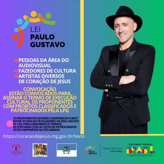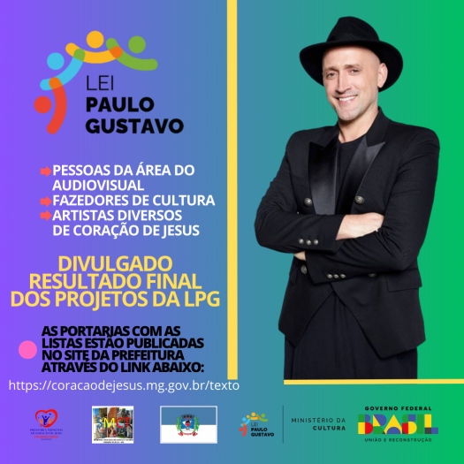 A Secretaria Municipal de Cultura e Turismo de Coração de Jesus divulga o Resultado FINAL dos projetos de proponentes dos recursos da Lei Complementar 195/2022 - Lei Paulo Gustavo, conforme portarias e listas anexas a esta matéria.